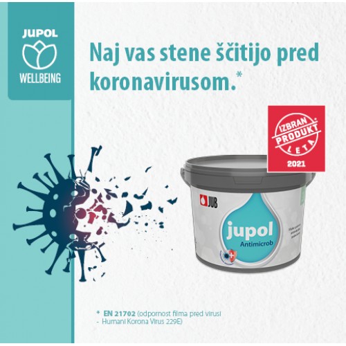 Barva JUB Jupol Antimicrob je visoko pokrivna notranja zidna barva, na osnovi vodne disperzije polimernih veziv in specialnih dodatkov. Je dobro paroprepustna in ima nizek sijaj. Uporabna za dekorativno in antimikrobno zaščito sten in stropov.