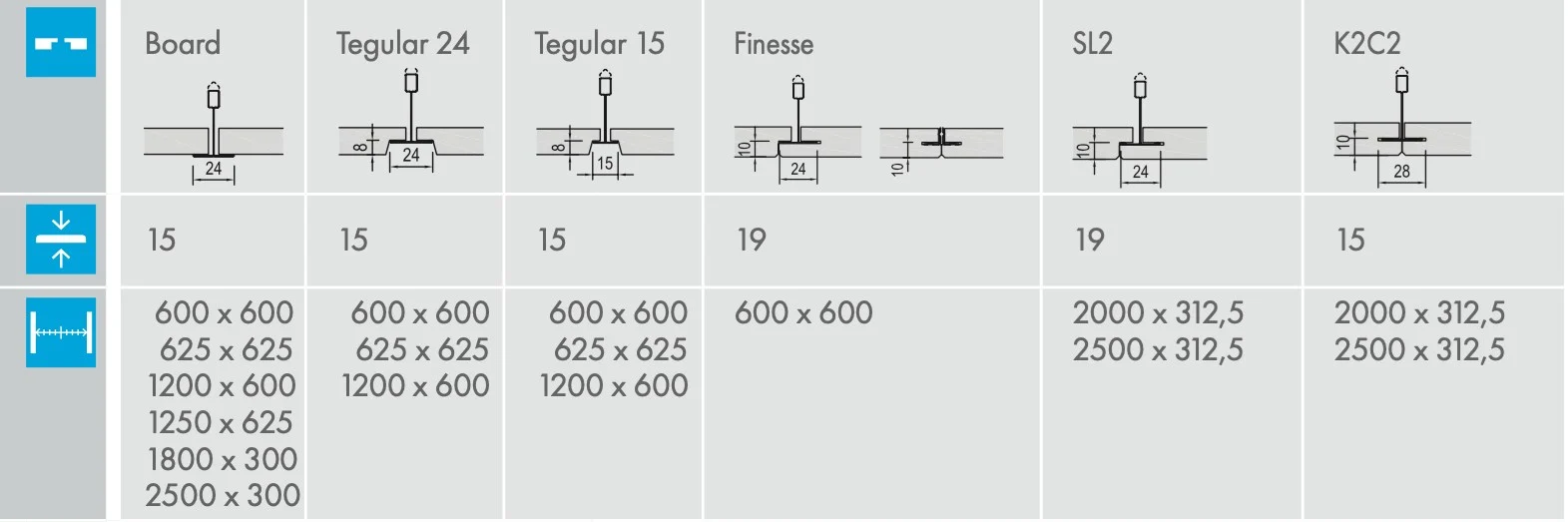 Konstrukcija je zasnovana za plošče roba Tegular 15 in ima v profilu 6 mm širok utor, ki je lahko enake barve kot zunanji del konstrukcije ali pa kontrasten. Za bolj subtilno estetiko izberemo konstrukcijo, ki je zunaj in znotraj bela. Če želimo večji efekt pa se bomo odločili za belo zunanjost in črno notranjost profila ali v celoti črne profile.