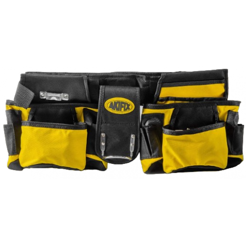 Dvodelni pas za orodje Akifix iz tekstila, ima 6 žepov, 8 manjših žepov za vijake, kovinsko zanko za kladivo.
