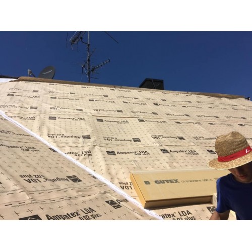Najprej je potrebno izolirati špirovce. Pod nobenim pogojem ne smejo ostati votla mesta med izolacijo in zgornjim robom špirovcev. Folijo Ampatex LDA 0,02 plus se položi vzporedno s slemenom in s potiskano stranjo navzgor preko obstoječe konstrukcije in izolacije. Polagamo jo z 10 cm preklopa in pritrdimo z lepenkarji ali sponkami tako, da pustimo preklopni rob prost. Preklope zlepimo z integriranim lepilnim trakom tako, da zagotovimo zrakotesnost. Lepilno površino čvrsto pogladimo. Tudi prečne stike folije prekrijemo za 10 cm in zlepimo z Ampacoll Superfix lepilom ali trakom Ampacoll XT 60mm.