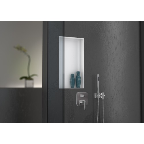 Je enodelni, brezšivni element iz 6 mm debelega, barvnega materiala z elegantnim videzom. 100% vidoodporna sistemska komponenta. Visokokavostna niša je popolna alternativa običajnim ploščicam.